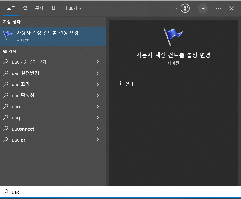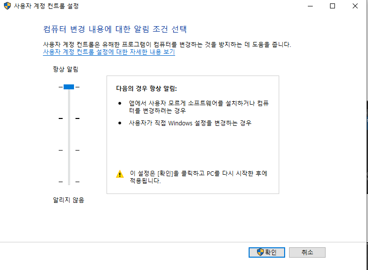 근데 버전을 올린 후로 실행할 때마다 해당메시지가 계속 떠서 찾아본 결과 UAC(사용자 계정 컨트롤 설정 변경)으로 해결할 수 있더라고요.