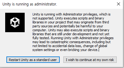 Unity is running with Administrator privileges, which is not supported. Unity executes scripts and binary libraries in your project that may originate from third party sources and potentially be harmful to your computer. Unity may also execute scripts and binary libraries that are still under development and not yet fully tested. Running Unity with Administrator privileges may lead to catastrophic consequences, including but not limited to accidental data loss, change of global system settings or even bricking your device.