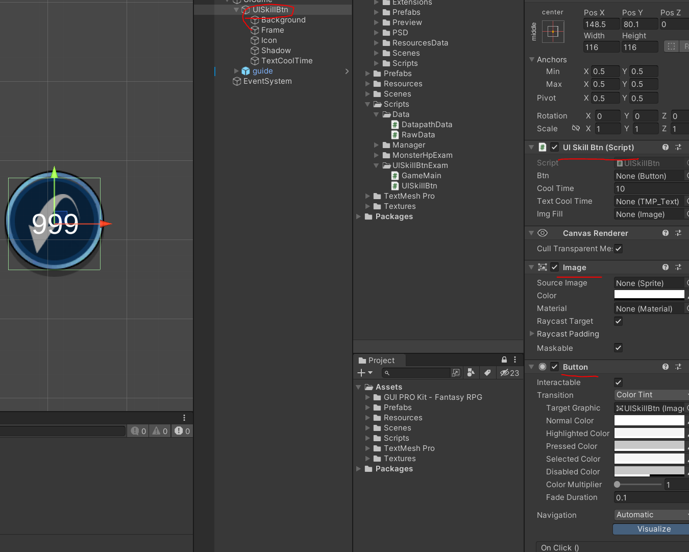 7. 처음 영역을 잡은 오브젝트에 작성한 스크립트와 Image, Button컴포넌트를 추가해줘요.
