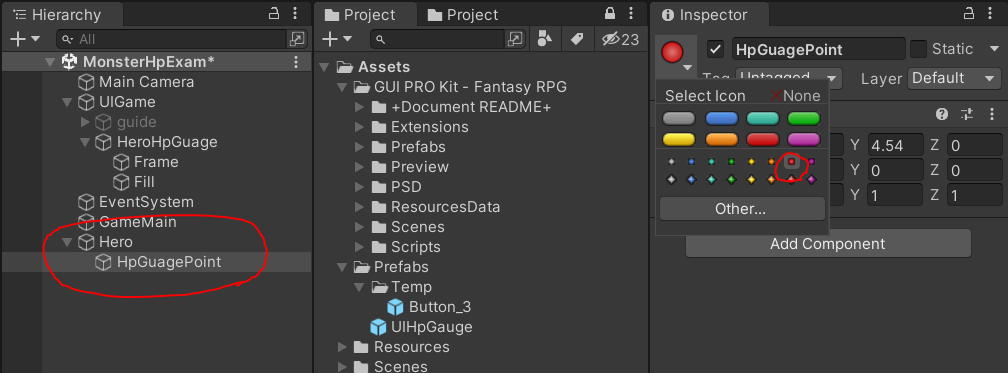 4. 게임 오브젝트로 플레이어를 생성해주고 체력바를 위치시킬 포인트를 잡아줍니다.