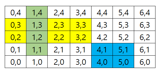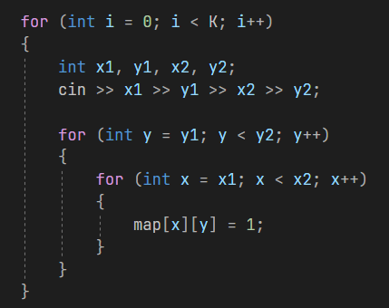입력 예시가 보면 0 2 4 4 이런 식으로 주어지는데 이건 0,2 좌표부터 4,4 좌표까지 맵에 그리라는 건데 이걸 그대로 코드에 바로 사용할 순 없었어요.