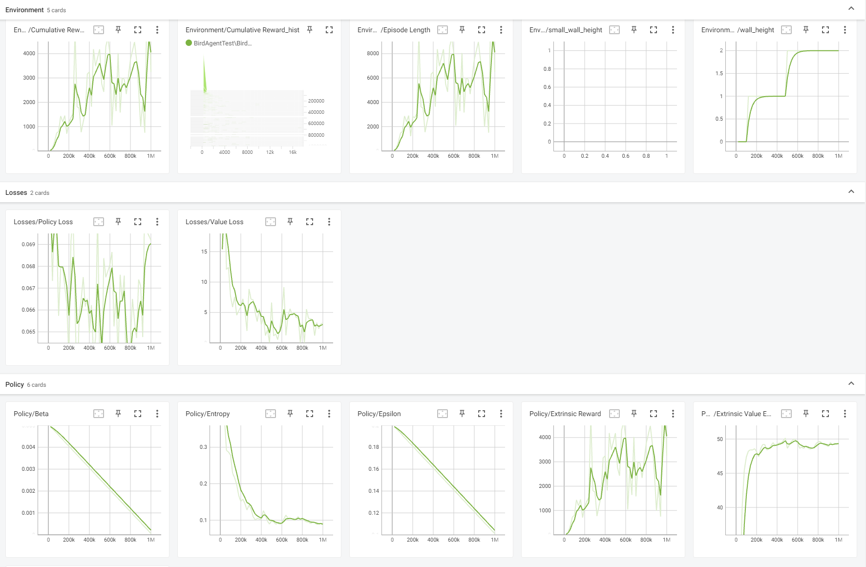 에이전트는 Jump 메소드만을 사용할 수 있어서 점프타이밍만 조절하면서 생존하는 기능이기 때문에 비교적 쉽게 학습이 된 거 같아요.