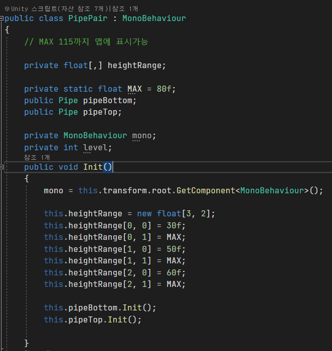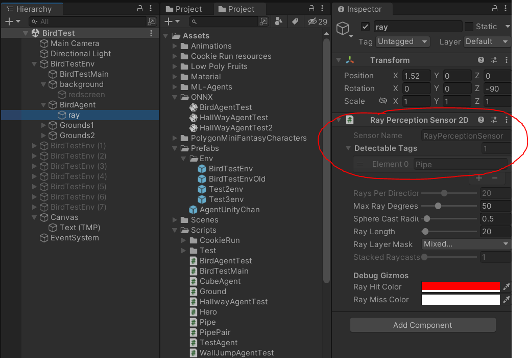 움직이는 파이프 들에 레이를 통해서 감지할수있는 박스콜라이더를 달아 주었고 태그를 Pipe로 입력해줘서 최대한 파이프에 충돌을 안하며 생존할 수 있도록 학습시켰어요.