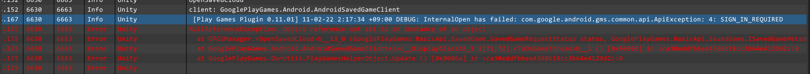 at GPGSManager.<OpenSavedCloud>b__13_0 (GooglePlayGames.BasicApi.SavedGame.SavedGameRequestStatus status, GooglePlayGames.BasicApi.SavedGame.ISavedGameMetadata metaData) [0x00026] in <a9142a370e734de898e2f50617bb764f>:0