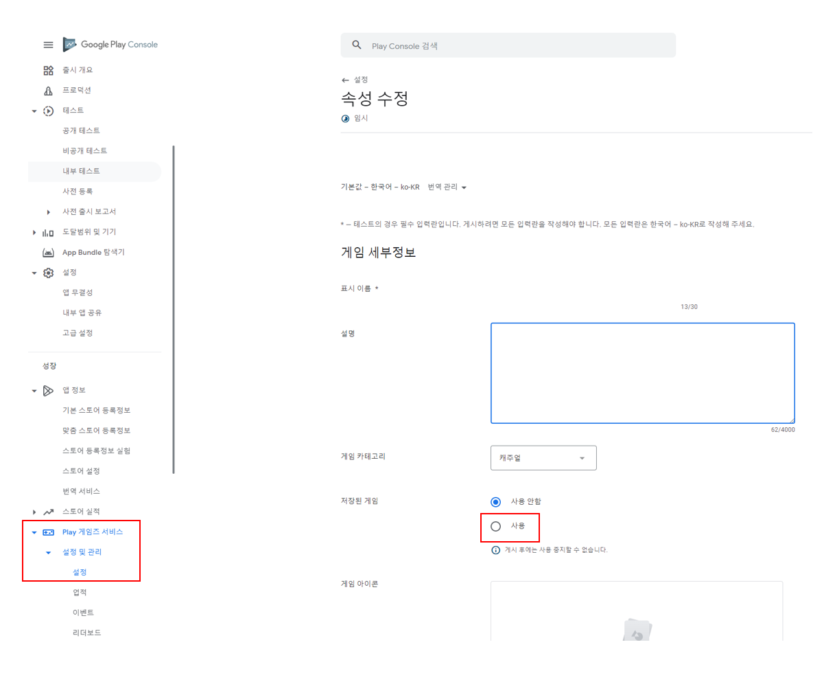 구글플레이콘솔 => Play 게임즈 서비스 => 설정 및 관리 => 설정 => 속성수정