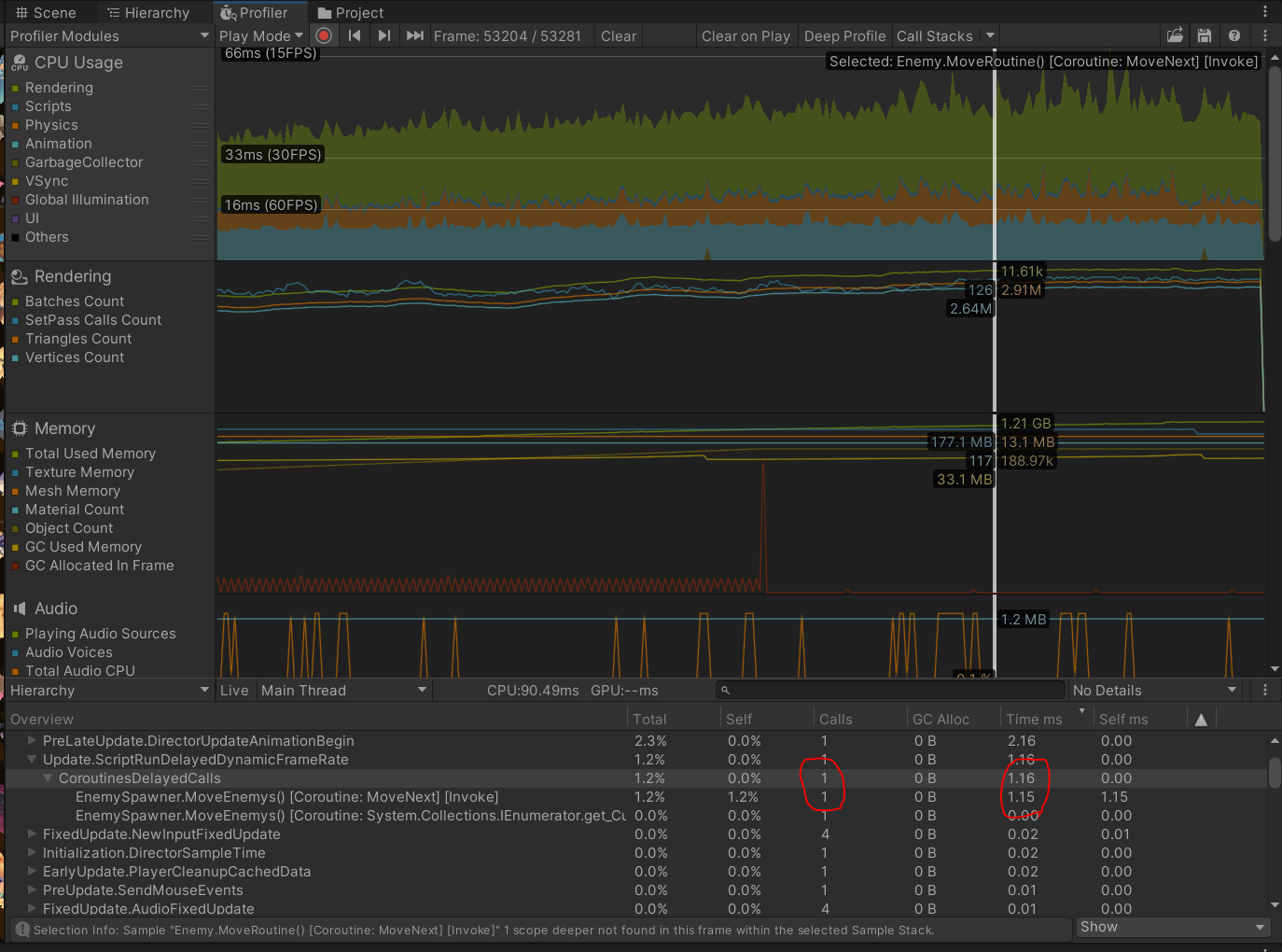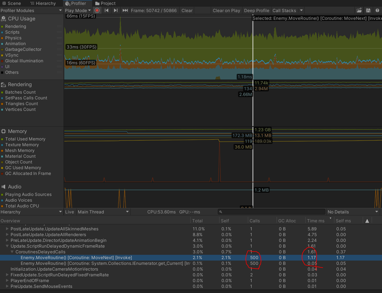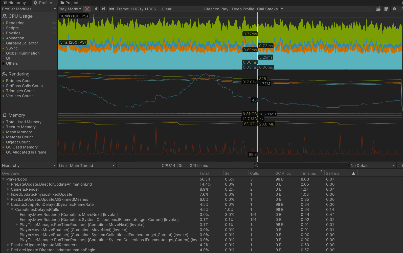 확인을 해보니 예상대로 대규모의 적 오브젝트들이 리소스를 가장 많이 사용하는 것 을 확인 하였고 CoroutineDelayedCalls안에 이동관련해서 리소스를 가장 많이 잡아먹고 있었기에 고민을 해봤어요.