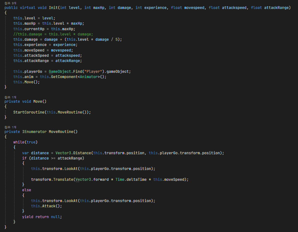 적오브젝트 스크립트인데 각 오브젝트마다 생성이 되면 MoveRoutine 코루틴을 오브젝트가 죽을 때까지 실행하게 되는 코드로 작성이 돼있어요. 즉 Enemy객체가 200개라면 코루틴 200개가 돌고 있는 거죠.