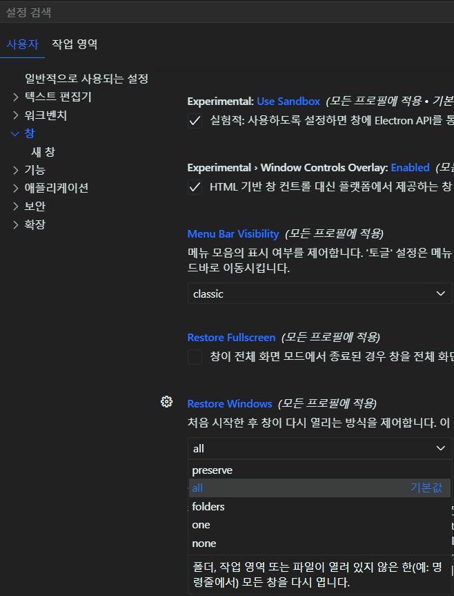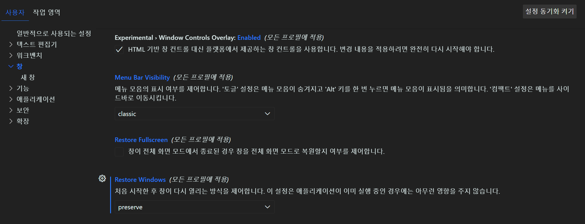 2. 창 -> 'Restore Windows' (모든 프로필에 적용) 찾기