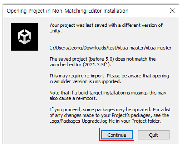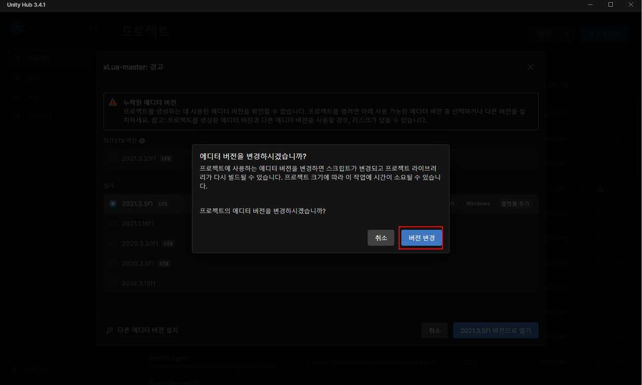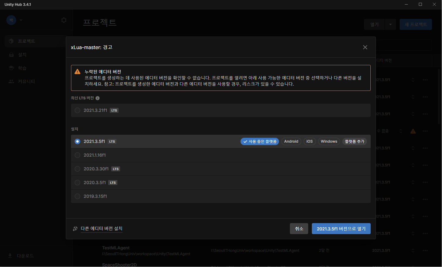 이렇게 에디터 버전이 누락됐다고 나오는데 전 그냥 설치되어 있는 2021.3.5f1 버전으로 열었어요.