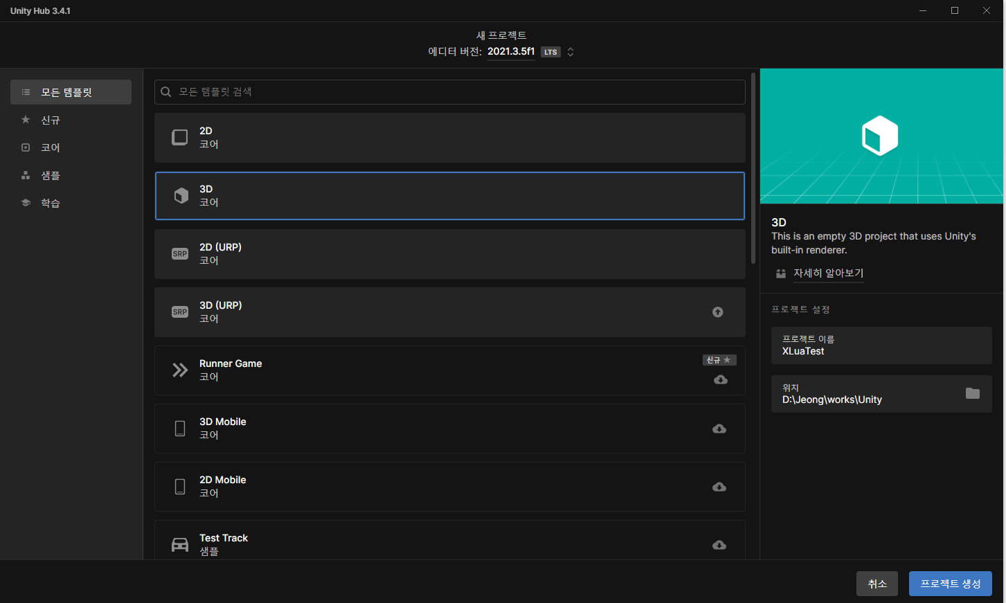 저는 3D 프로젝트를 만들어서 테스트했어요.