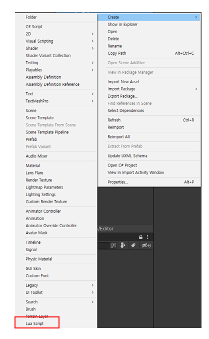 이제 Lua 스크립트를 작성해야 하는데 마우스 우클릭 했을 때 C# 스크립트처럼 Create 메뉴에 Lua스크립트가 없어서 이거 먼저 메뉴버튼을 만들어 줬어요.