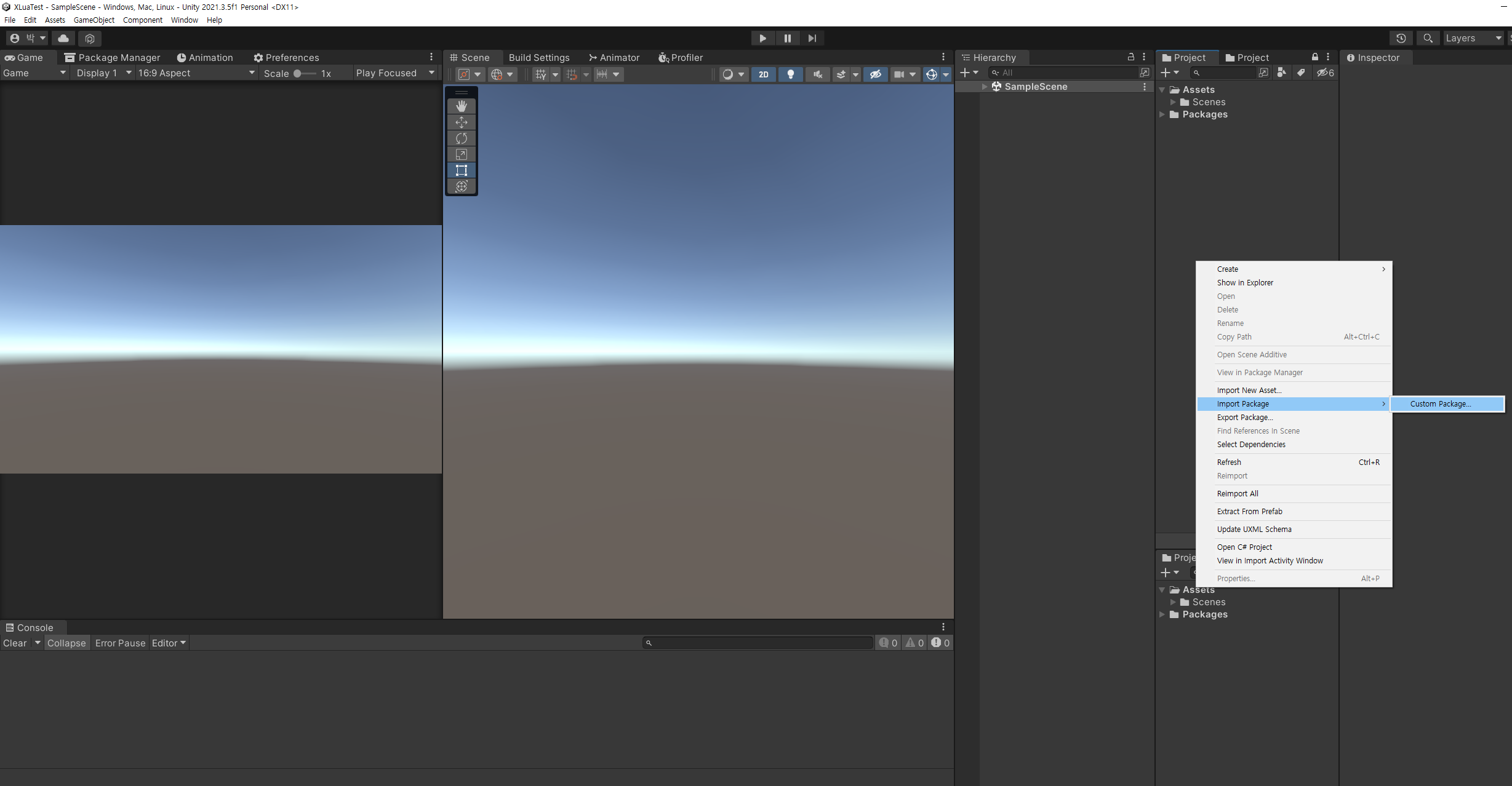생성된 프로젝트에 아까 뽑아낸 유니티 패키지를 임포트 해줘요.