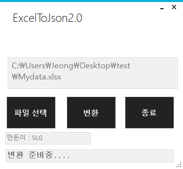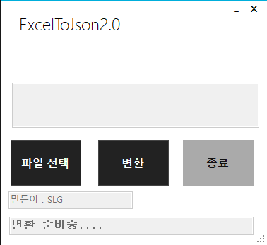 압축푸시고 SLG_ExcelToJsonConverter.exe 실행하시면 나와요. 폴더열기 누르셔서 변환할 엑셀파일 있는 경로를 선택해 주세요. 폴더만 선택할 수 있는 다이얼로그라서 아무것도 안보이실 텐데 정상이