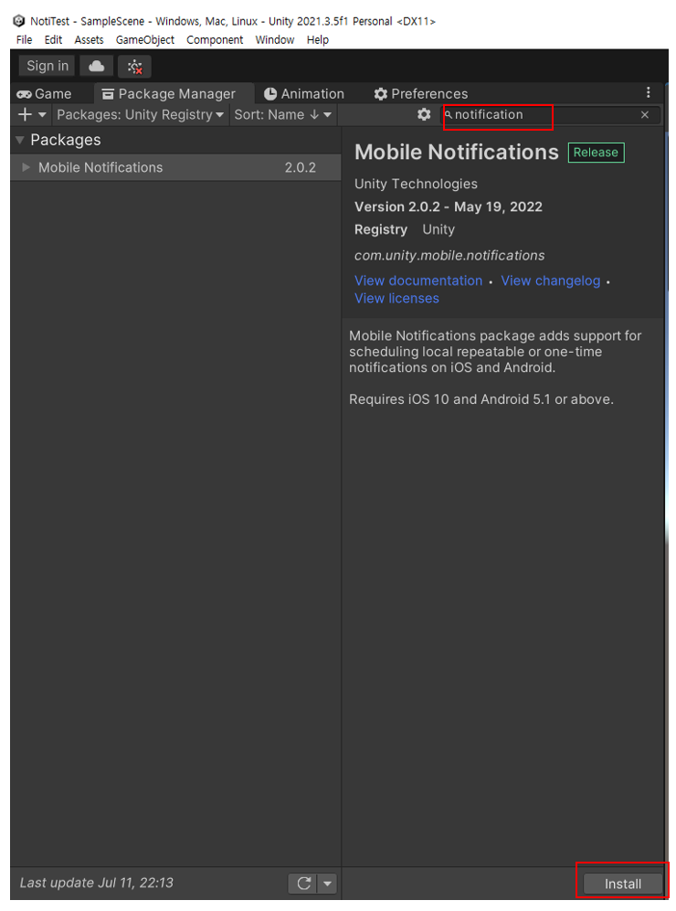 유니티에서 Mobile Notifications에 관련된 패키지를 제공하고 있기때문에 쉽게 구현할 수 있었습니다.