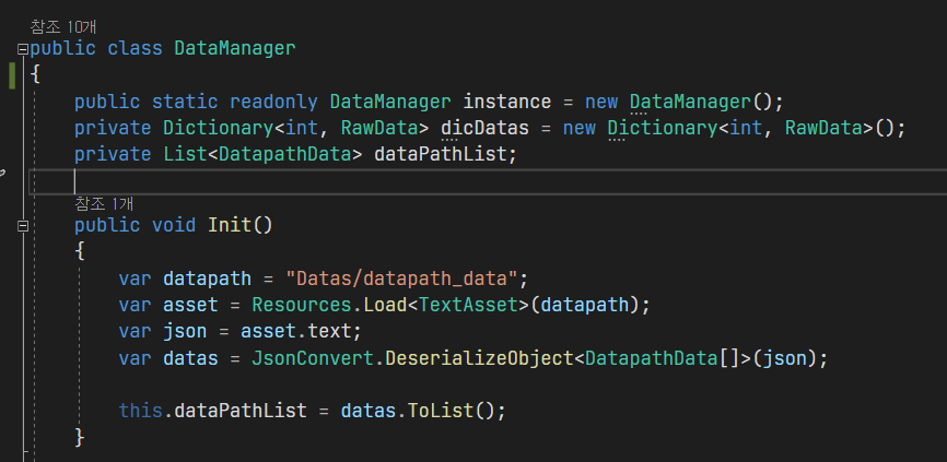 그래서 Datamanager에 데이터파일의 경로를 관리하는 리스트를 선언하고 데이터들의 경로가 담겨있는 데이터파일을 작성한다음 Init함수 에서 dataPathList에 데이터를 추가 해줬어요.